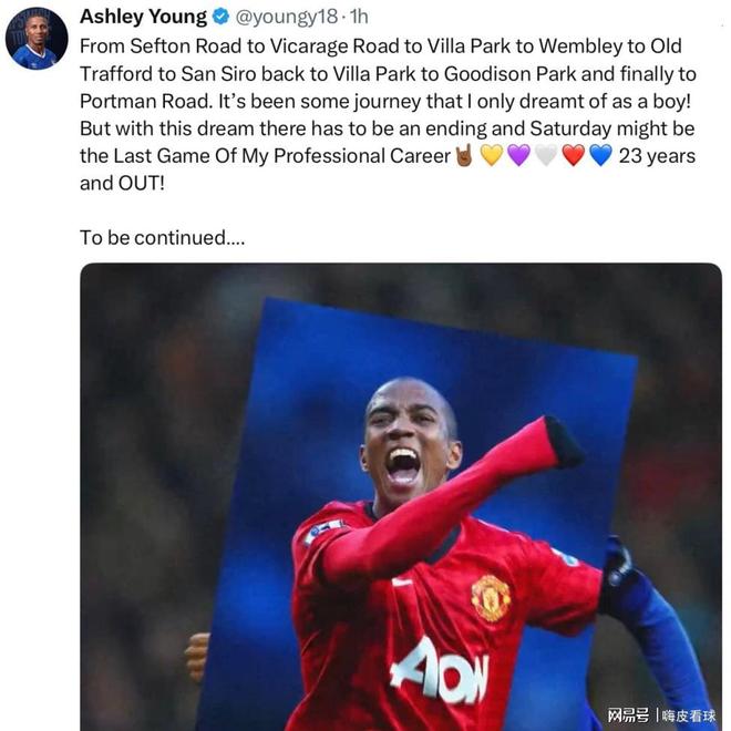 刚刚,曼联老队长阿什利·扬,在社交媒体自己宣布,本赛季末将会退役,结束长达23年的职业生涯。扬回顾了自己的足球之路,从沃特福德到阿斯顿维拉,然后来到曼联,随后转投国际米兰,重返维拉,最后效力埃弗顿和伊普斯维奇。